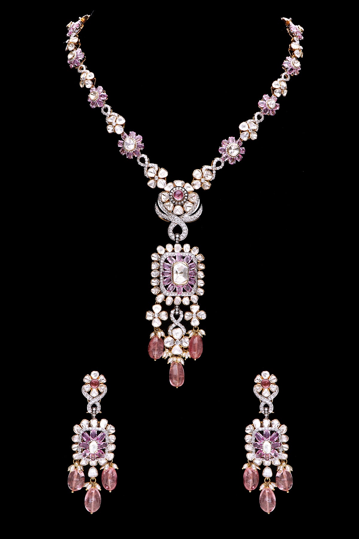 Luxurious tourmaline necklace with Polki diamonds and pearls - Necklace + Ear??