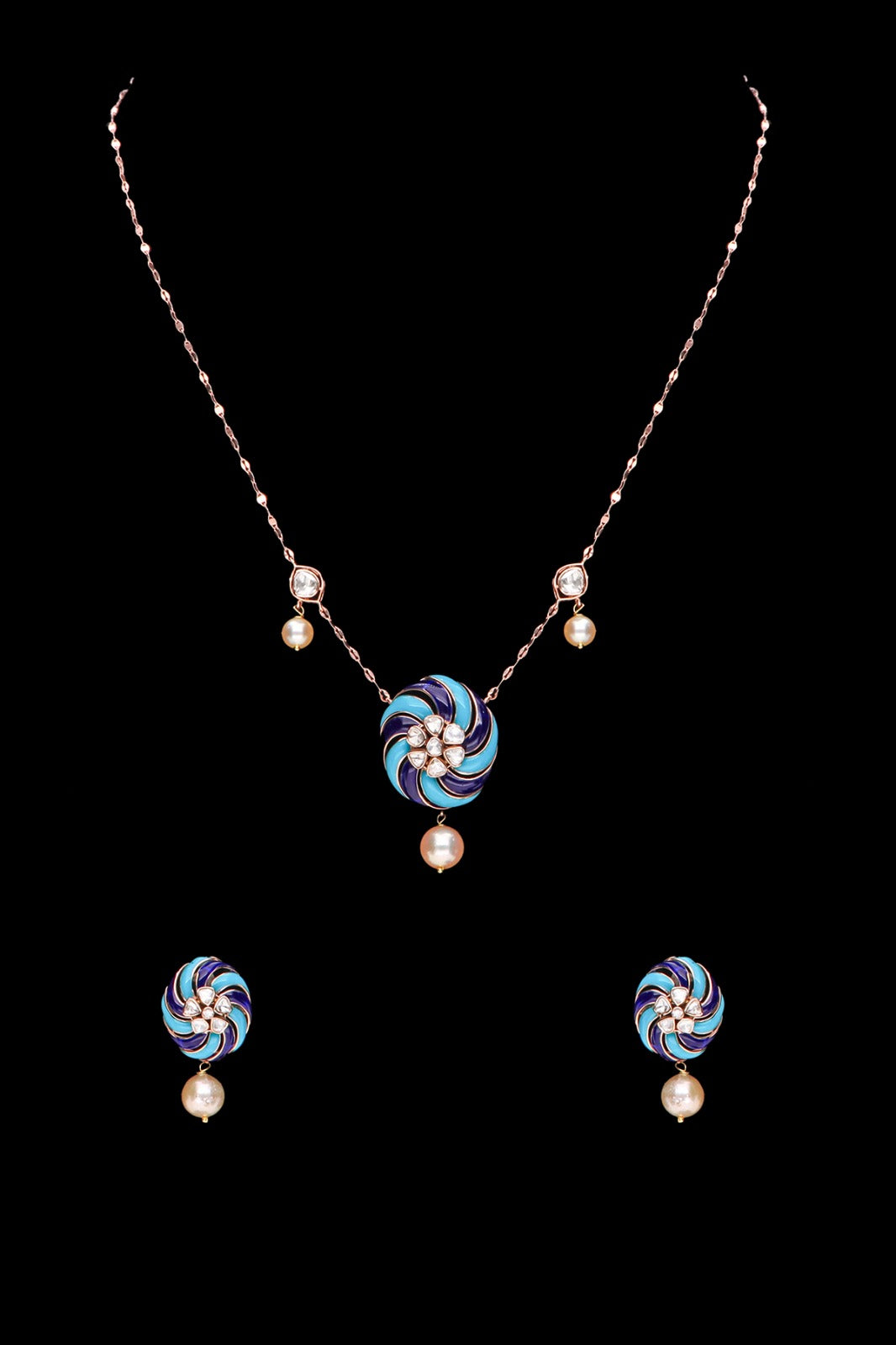 Light Weight Polki Pendant and Earring set In deep blue and blue enamel