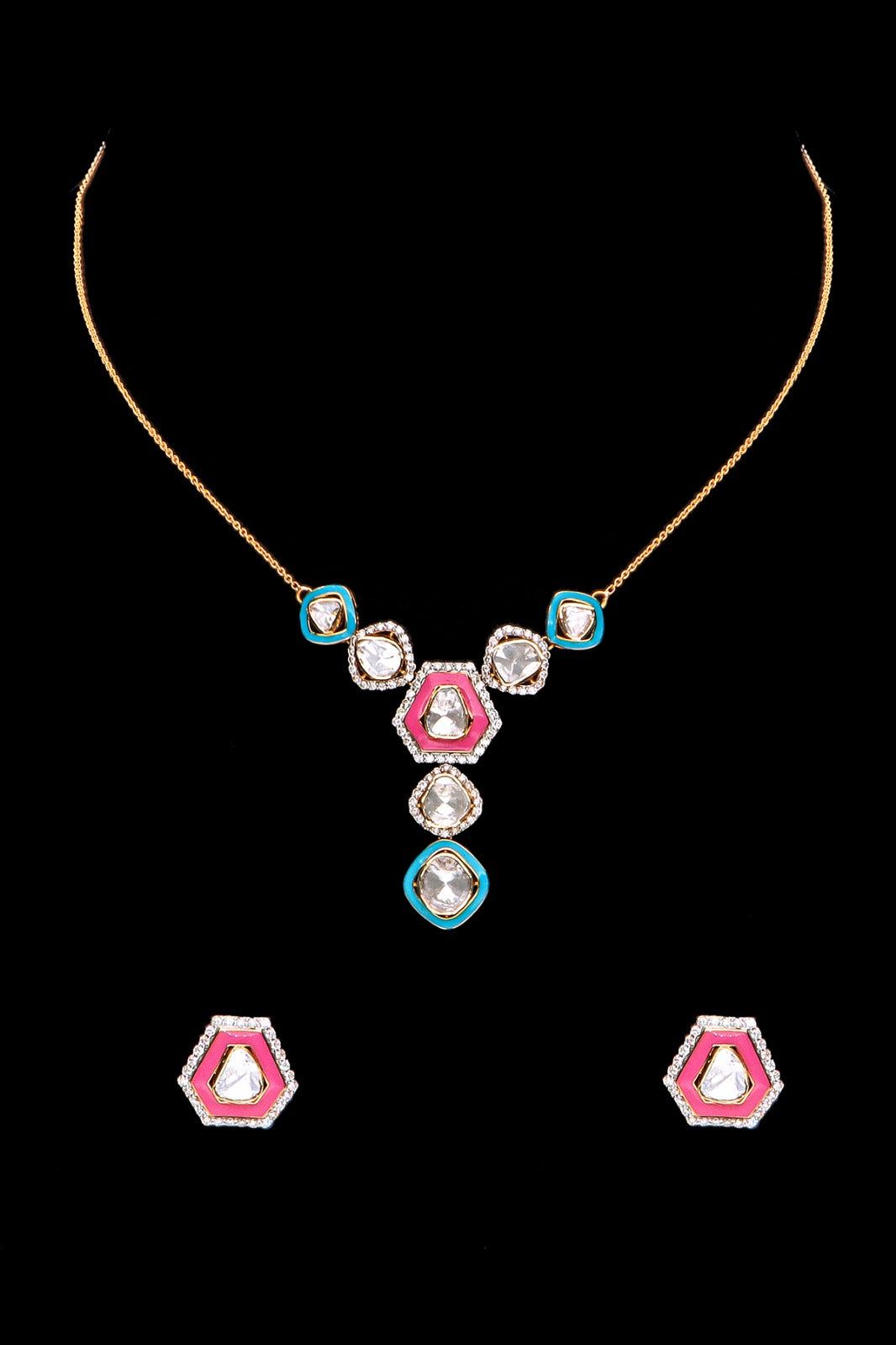 Light weight Polki Pendant and Earrings necklace with Pink and Blue Enamel