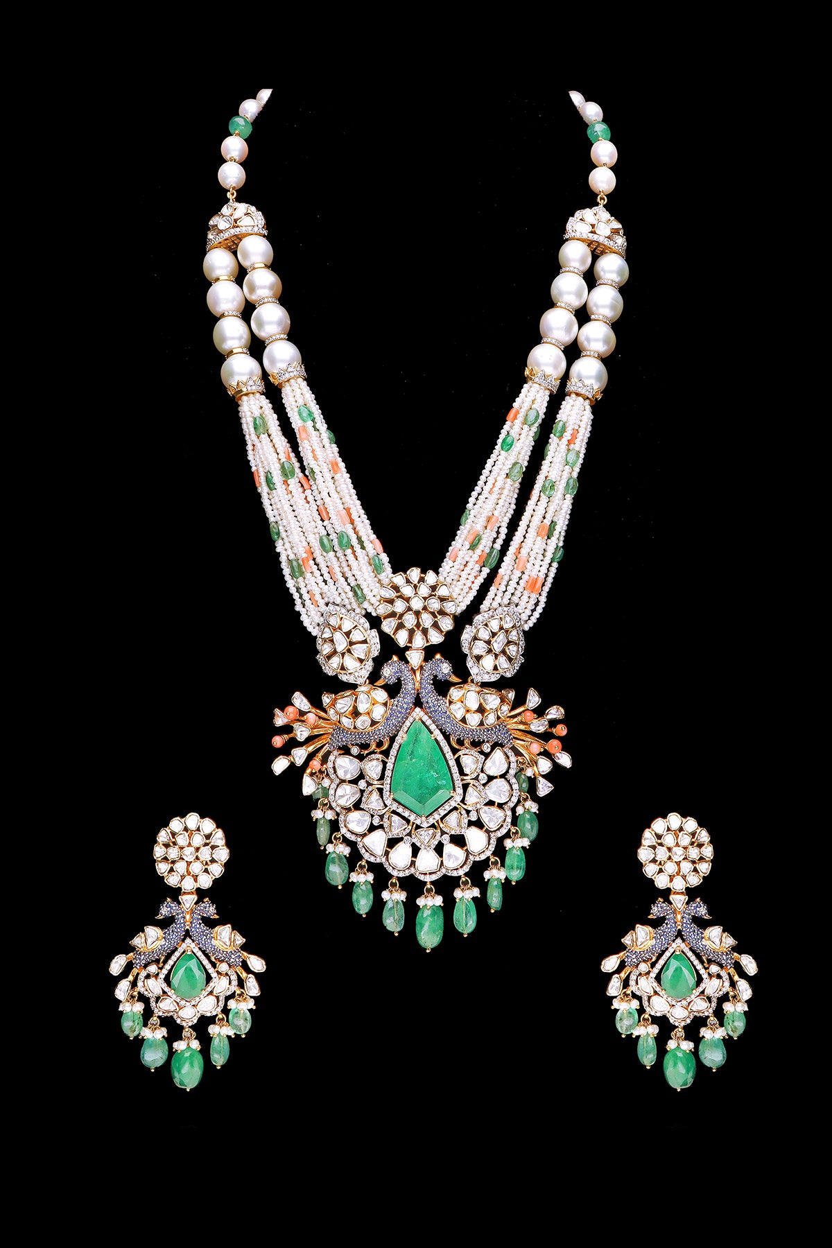 Polki Pearl Mala with Coral and Emerald Beads in Peacock Pendant and Earrings - Haram & Earrings