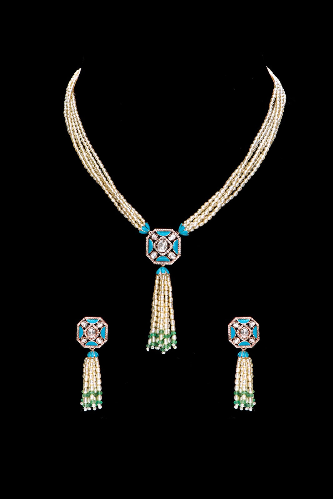 Polki Pearl Necklace with Aquamarine Pendant and Earrings