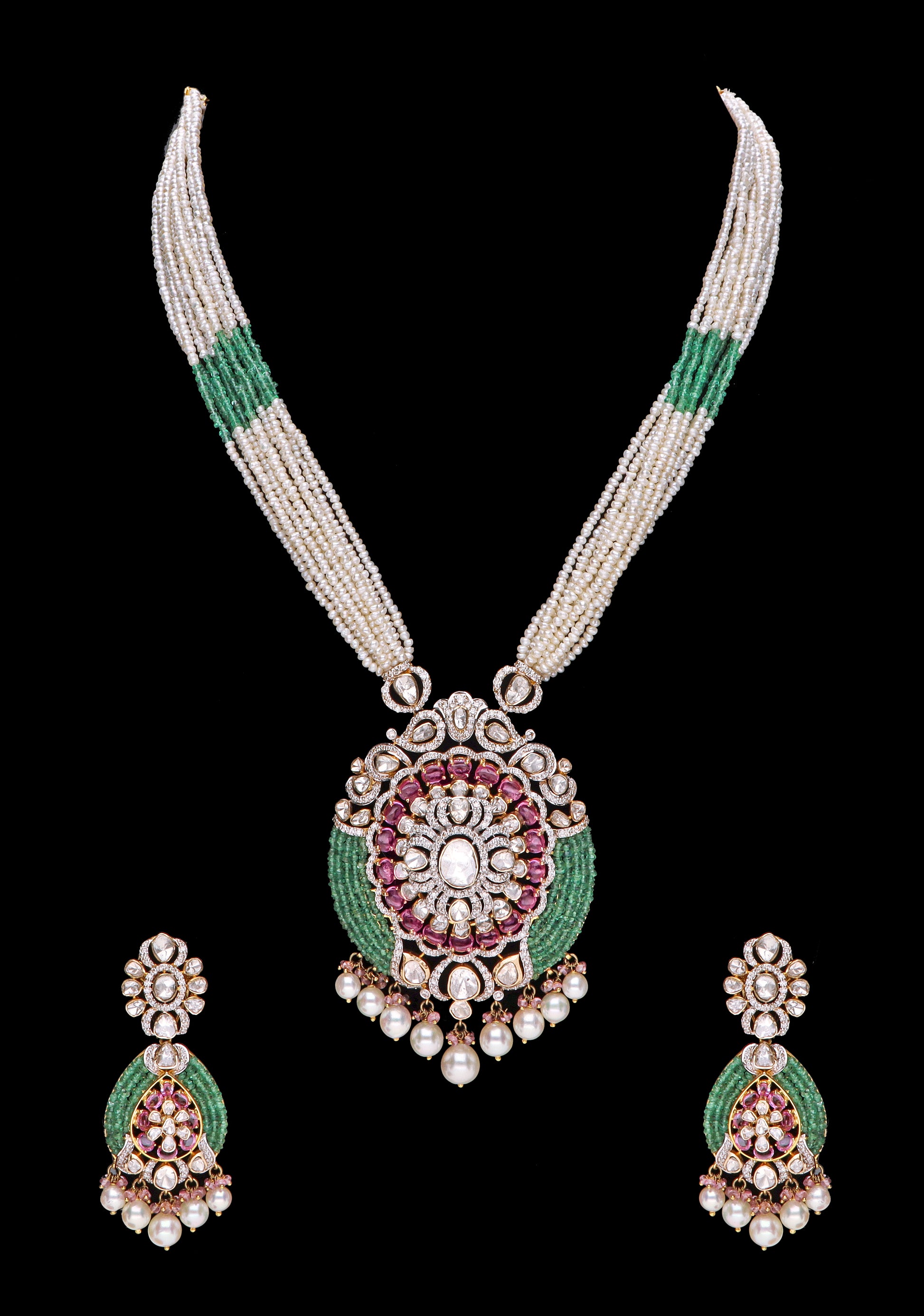 Polki Pearl mala with Emerald and Ruby Pendant and Earrings