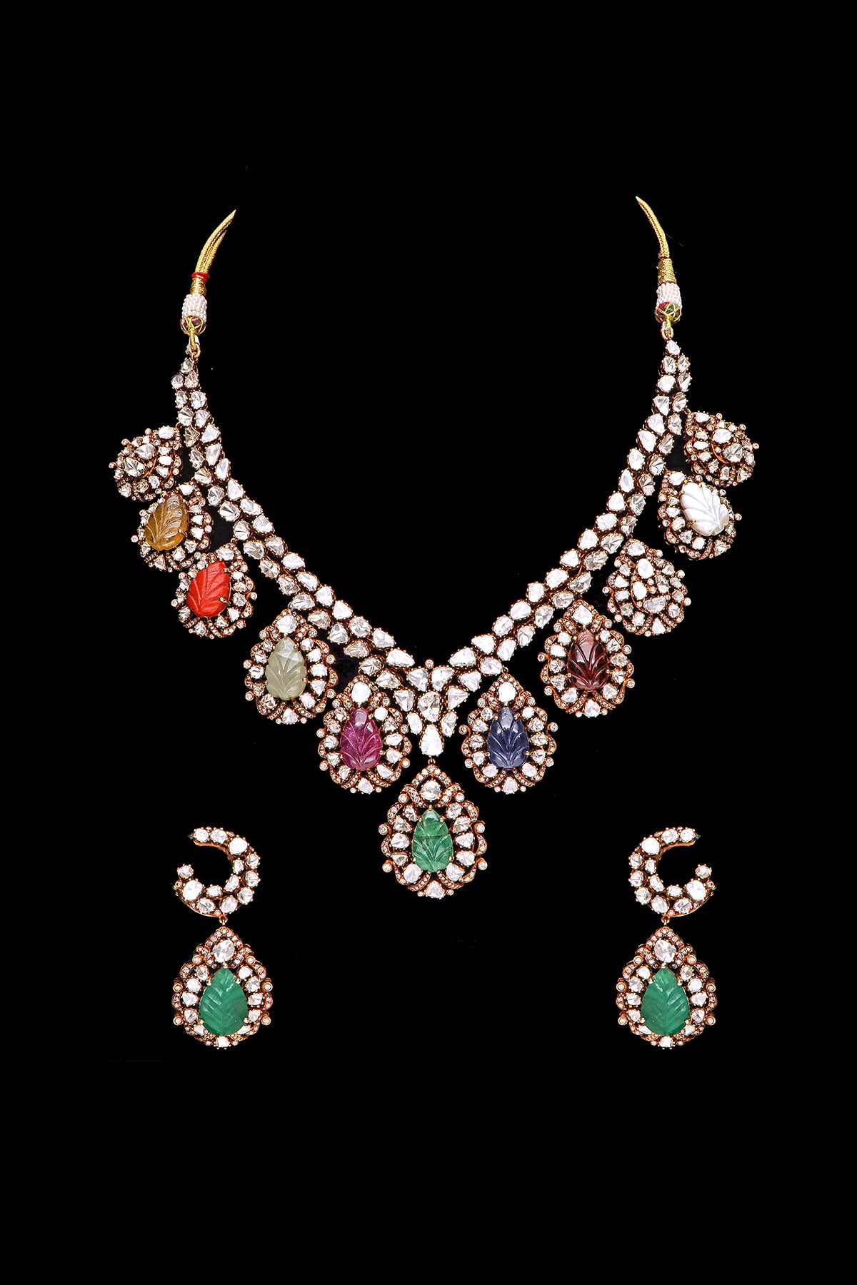 A Polki with Navaratna necklace set is a beautiful and significant piece of jewelry that combines traditional Indian design elements with spiritual and cultural symbolism.